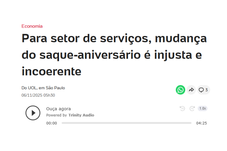 A Abrasel classificou como injustas e incoerentes as mudanças anunciadas pelo governo federal que impõem limites à antecipação do saque-aniversário do FGTS. Em entrevista ao UOL Economia, o presidente executivo da entidade, Paulo Solmucci, afirmou que a medida restringe o direito do trabalhador de utilizar um dinheiro que é seu e reduz o poder de consumo, com reflexos diretos no comércio e nos serviços — setores que respondem por 70% do PIB.