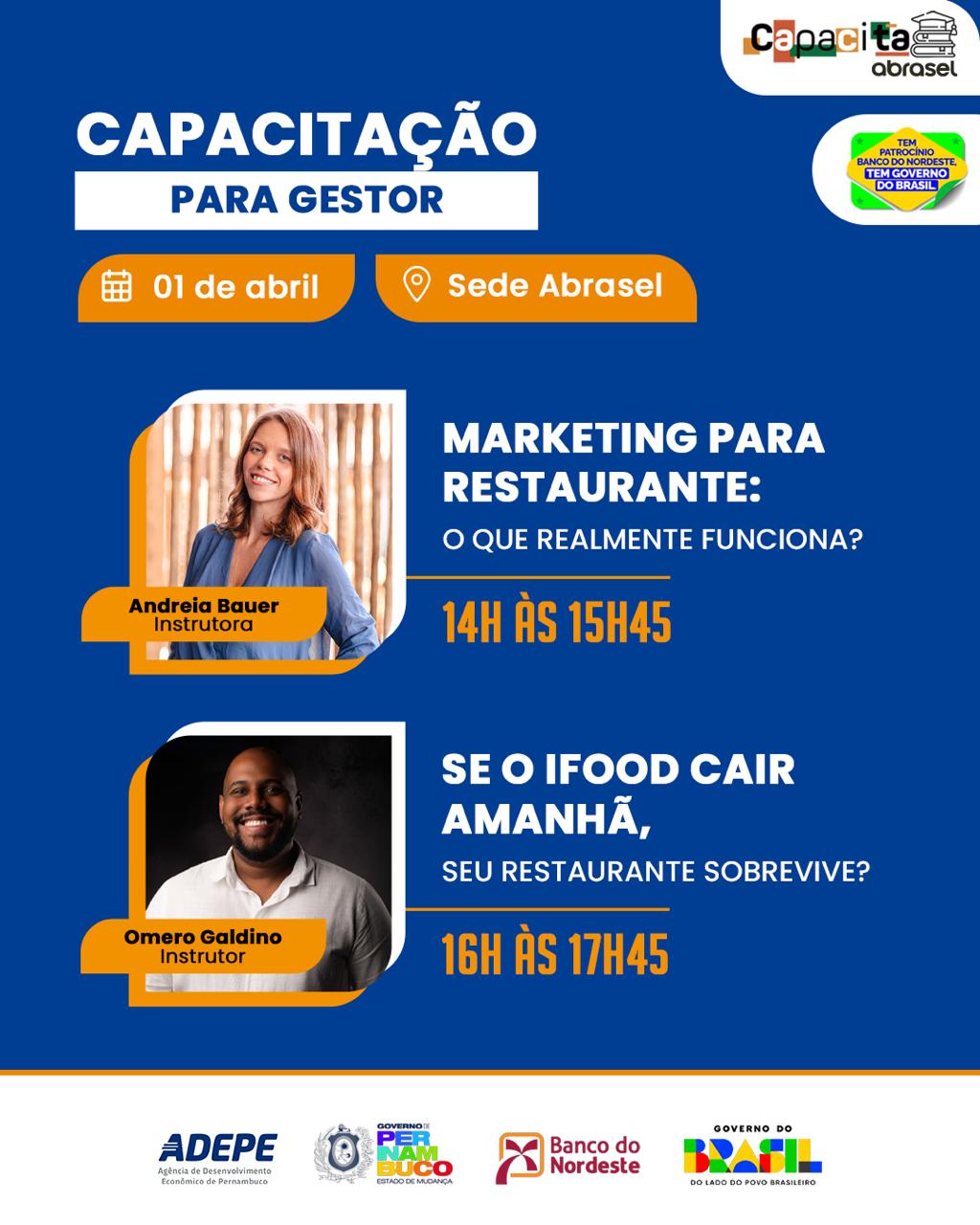O Capacita Gestor faz parte das ações da Abrasel em Pernambuco voltadas ao desenvolvimento do setor e conta como patrocínio do Governo Federal, por meio do Banco do Nordeste, parceiro no fortalecimento e no desenvolvimento do setor de alimentação fora do lar.